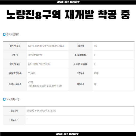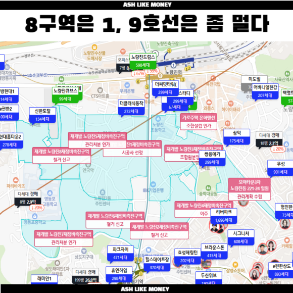 노량진뉴타운은 향후 재개발이 되어 동작구를 완전히 바꿀 곳이다. 흑석동이 2급지 이상된 곳인 만큼, 비슷한 동네인 노량진동도 이정도 급이 될 곳이다. 동작구 자체가 재개발 및 재건축에 관심이 많아 지주택도 가장 많이 성공시킨 사례가 있는 곳이다. 그래서 노량진동 뿐만 아니라 사당동이나 상도동 역시 성공할 가능성이 크다. 노량진뉴타운은 한강뷰까지 가능하기에 사당이나 상도보다 더 높은 평가를 가지고 노량진튜타운 중 노량진8구역은 가장 빠른 속도로 진행 중이다. 21년 관리처분인가를 받고 현재는 이주 및 착공 중이다.
