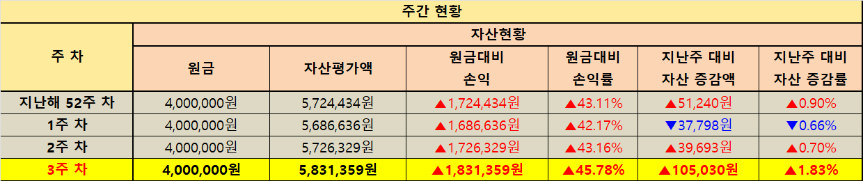 지난주와 비교해 보면 한 주 동안 전체 자산이 +985,870원 증가했습니다. 일주일 만에 약 100만 원에 가까운 자산이 늘어난 셈입니다. 전체 자산 증감률은 +2.19%입니다. 매주 이렇게 드라마틱한 상승이 있을 수는 없겠지만 적어도 올바른 방향으로 나아가고 있다는 확신을 갖기에는 충분한 성과입니다.