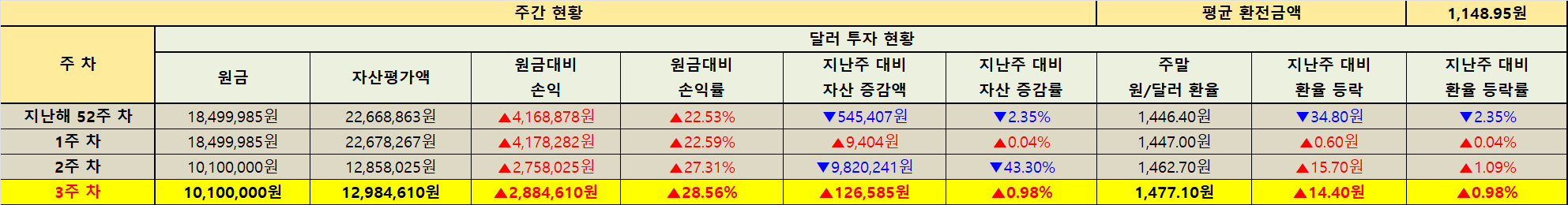 하지만 달러 기준으로 살펴보면 원금 대비 수익률은 +3.81%에 그쳤습니다. 원화 수익률(+33.46%)과 달러 수익률(+3.81%) 사이에 이렇게 큰 격차가 발생하는 이유는 무엇일까요? 바로 '킹달러'의 위력, 환율 상승 덕분입니다. 이번 주 원/달러 환율은 지난주 대비 14.40원 상승한 1,477.10원을 기록했습니다. 환율 상승률만 +0.98%입니다.
