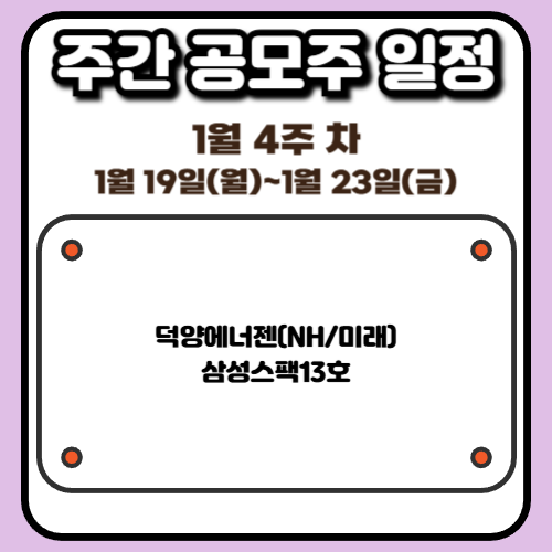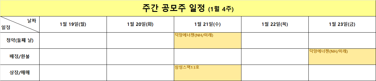 이번 주 공모주 일정은 전반적으로 상당히 단출한 편입니다. 청약 일정은 수요일 덕양에너젠 한 종목으로 구성되어 있으며, NH투자증권과 미래에셋증권을 통해 청약이 진행됩니다. 같은 날 삼성스팩13호의 상장 및 매매가 예정되어 있고 금요일에는 덕양에너젠의 배정 및 환불 일정이 이어집니다. 일정 자체만 놓고 보면 투자자 입장에서는 체력 소모가 크지 않은 한 주라고 볼 수 있겠습니다.