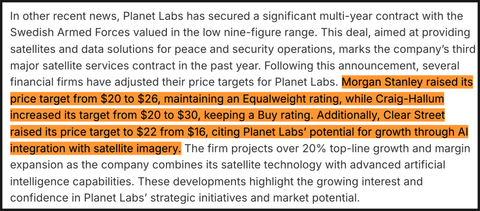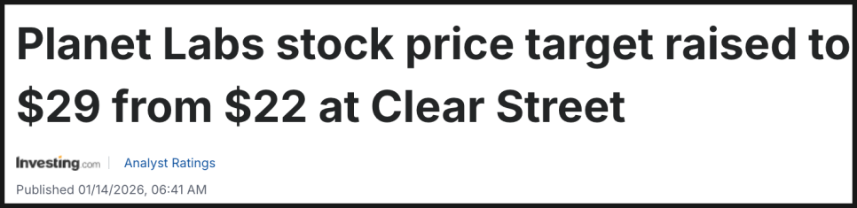 이번 리포트는 다른 증권사들의 최근 평가 흐름과도 일관됩니다. 모건스탠리는 목표주가를 20달러에서 26달러로 올리면서 중립(Equalweight)을 유지했고, 크레이그-할럼(Craig-Hallum)은 30달러로 상향하며 매수 의견을 유지했습니다. 시장 전반적으로 플래닛 랩스의 전략 방향과 정부·국방 중심 사업 확장에 대한 신뢰도가 높아지고 있다는 신호로 볼 수 있습니다.