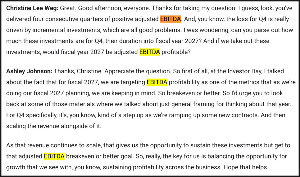 마지막으로 가이던스를 보면, 2026 회계연도 전체 매출 전망치는 2억9,700만~3억100만 달러로 상향됐고, 연간 기준 조정 EBITDA 흑자 달성도 공식적으로 제시됐습니다. 연간 EBITDA 흑자는 회사가 이제 구조적으로 수익을 낼 수 있는 단계에 들어섰음을 의미하는 중요한 이정표라고 볼 수 있습니다.