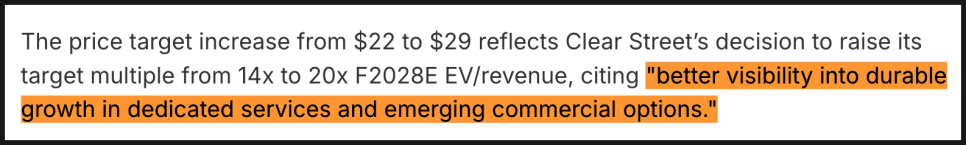 목표주가를 22달러에서 29달러로 올린 직접적인 이유는 밸류에이션 기준 변경에 있습니다. 클리어 스트리트는 2028년 예상 매출 대비 기업가치 배수(EV/Revenue)를 기존 14배에서 20배로 상향 적용했습니다. 전용 위성 서비스와 신흥 상업용 솔루션에서 장기적이고 반복적인 매출이 발생할 수 있다는 가시성이 이전보다 훨씬 높아졌다고 판단했기 때문입니다. 다시 말해, “성장이 일시적이지 않고 지속 가능하다”는 확신이 생겼다는 의미로 해석할 수 있습니다.
