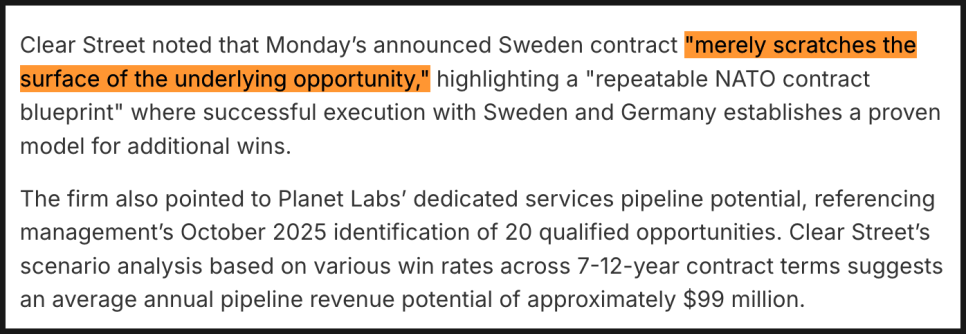 이번에 발표된 스웨덴 국방 계약에 대한 해석도 인상적입니다. 클리어 스트리트는 이 계약을 단순한 단일 수주로 보지 않았습니다. 오히려 “이 계약은 시작에 불과하다”고 표현하면서, 스웨덴과 독일에서의 성공 사례가 나토(NATO) 국가들을 대상으로 반복 가능한 계약 모델, 즉 일종의 표준 청사진이 될 수 있다고 평가했습니다. 한 국가에서 위성 서비스와 데이터 솔루션이 성공적으로 운영되면, 다른 회원국으로 확산될 가능성이 높다는 논리입니다.