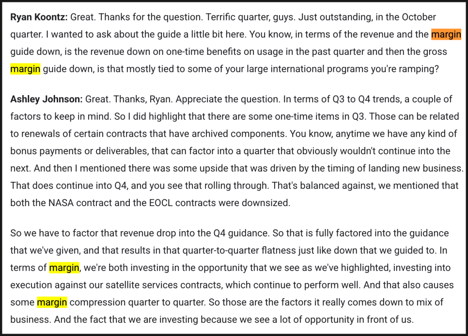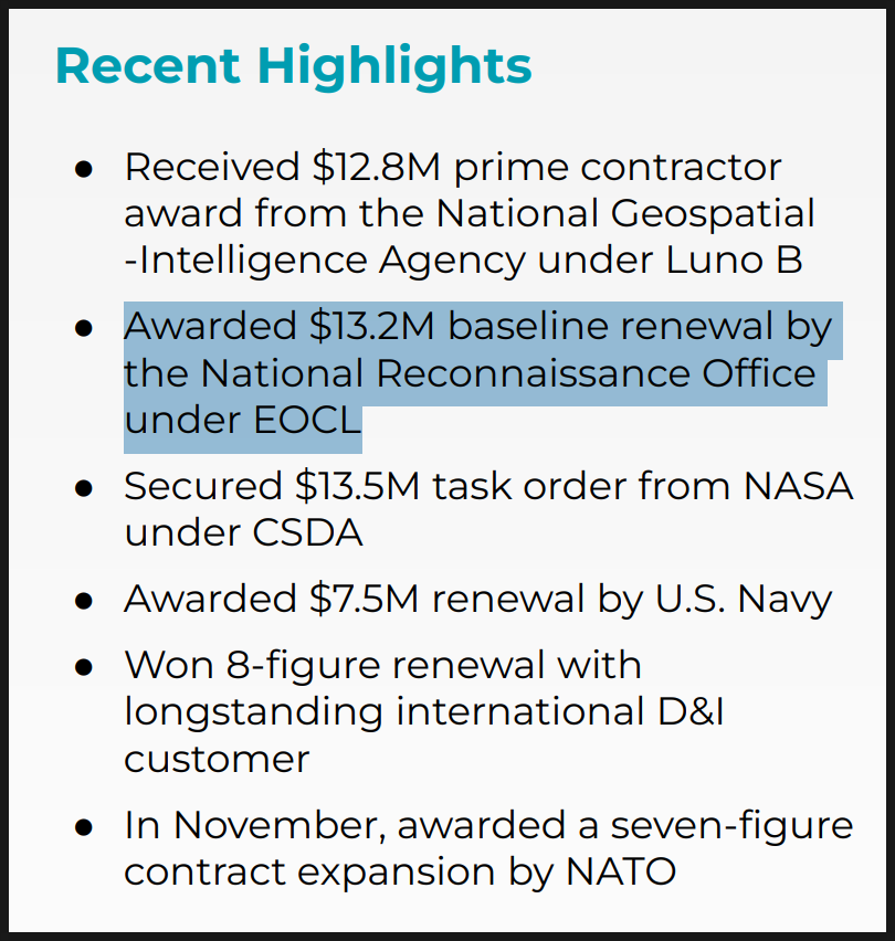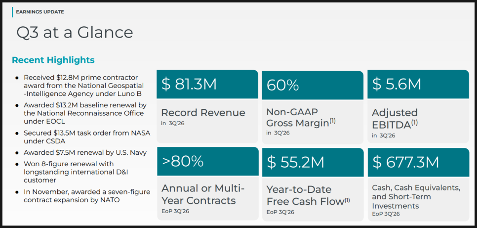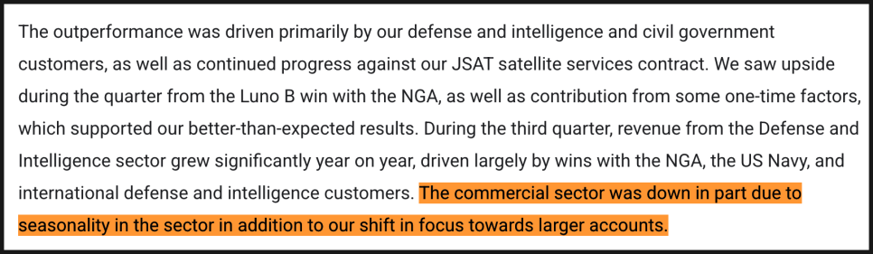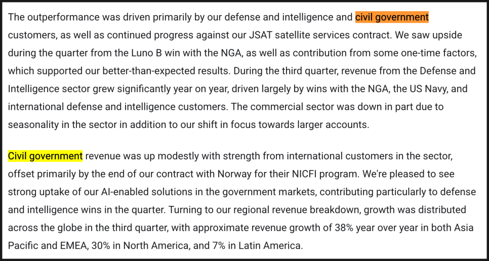 민간 정부(Civil Government) 부문은 전년 대비 성장률은 크지 않았지만, 분기 대비로는 두 자릿수 성장을 기록했습니다. NASA와의 상업 위성 데이터 구매 프로그램(CSDA) 계약이 대표적인데요. 1년간 1,350만 달러 규모의 계약을 확보했고, 분기 종료 이후에는 재난 대응 목적의 추가 계약도 따냈습니다. 이 부문은 단기 변동성은 있지만, 장기적으로는 기후·재난 대응 수요와 맞물려 다시 확대될 여지가 있다는 점을 회사는 강조했습니다.
