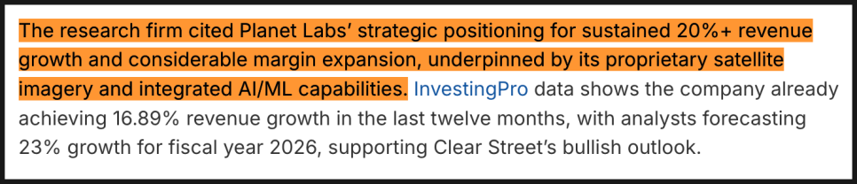 클리어 스트리트가 이렇게 강한 시각을 유지한 핵심 이유는, 플래닛 랩스가 앞으로도 연 20% 이상 매출 성장을 지속할 수 있는 구조에 들어섰다고 판단했기 때문입니다. 단순히 위성 이미지를 파는 회사가 아니라, 자체 위성 데이터에 AI·머신러닝 기술을 결합한 ‘통합 솔루션 기업’으로 자리 잡았다는 평가입니다.