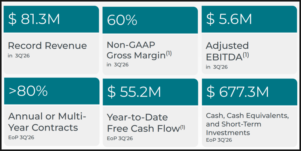 먼저 3분기 매출은 8,130만 달러로 전년 대비 약 33% 성장했습니다. 특히 중요한 점은 성장 속도가 다시 빨라졌다는 점인데요. 단순히 외형만 커진 것이 아니라, 수익 구조도 함께 개선됐습니다. 비GAAP 기준 매출총이익률은 60%를 기록했고, 조정 EBITDA는 560만 달러 흑자를 내면서 4개 분기 연속 EBITDA 흑자를 이어갔습니다. EBITDA는 본업에서 현금 창출력이 있는지를 보여주는 지표라서, 연속 흑자는 사업 구조가 안정 단계로 들어가고 있다는 신호로 해석됩니다.