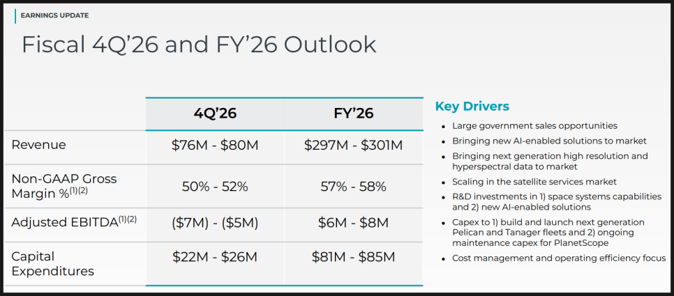 미국 국가정찰국(NRO)과의 계약도 중요합니다. PlanetScope 광역 관측 데이터 계약이 2026년 중반까지 연장됐고, 연환산 기준으로 보면 연간 약 2,100만 달러 수준의 안정적인 매출을 의미합니다. 고해상도 위성 이미지와 관련해서도 프레임워크 계약을 확보해, 향후 필요에 따라 추가 주문이 가능한 구조를 만들어 두었습니다. 미국 정부 셧다운과 예산 불확실성이라는 변수에도 불구하고, 핵심 정부 고객과의 관계가 유지되고 있다는 점은 긍정적으로 평가할 수 있는 대목입니다.