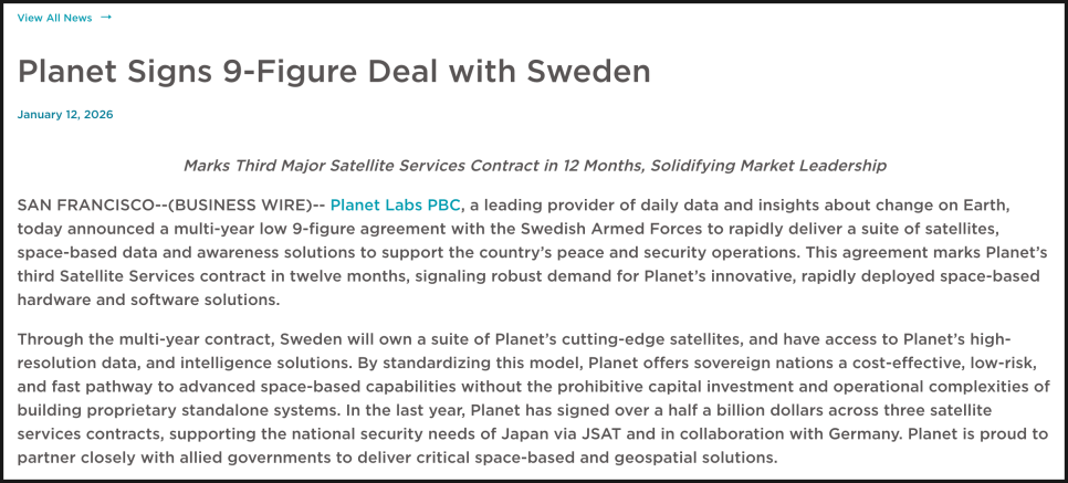 우선 가장 중요한 소식부터 짚고 가겠습니다. 플래닛 랩스는 최근 스웨덴 국방 당국과 다년 계약을 체결했습니다. 시장에서는 이 계약 규모를 9자리, 즉 수억 달러짜리 계약으로 보고 있는데요. 단순히 위성 사진을 공급하는 수준이 아니라, 위성과 데이터, 그리고 이를 활용한 서비스 전반을 포함하는 계약이라는 점이 핵심입니다.
