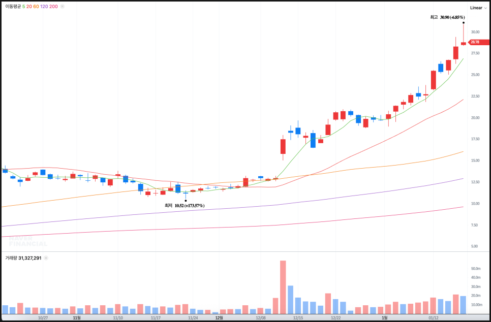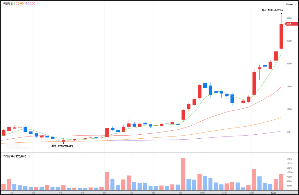 최근 일봉 흐름은 짧은 조정 이후 다시 급하게 치고 올라가는 전형적인 강세 패턴입니다. 5일선과 20일선이 가파르게 상승하면서 주가를 끌어올리고 있고, 조정이 나와도 이 단기 이동평균선 근처에서 바로 반등이 나오는 모습이 반복되고 있습니다. 거래량 역시 상승 구간에서 확실히 늘어나고 있어, 단기 매수세가 실제로 유입되고 있다는 점이 확인됩니다.