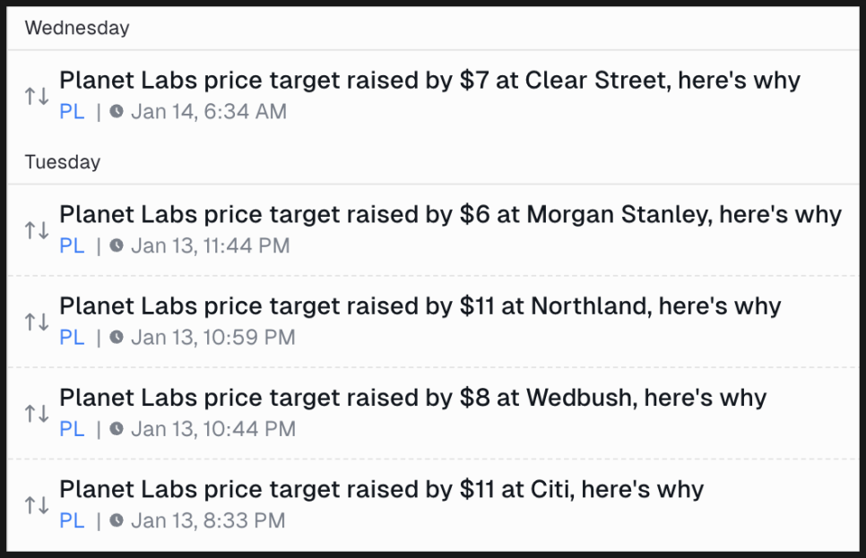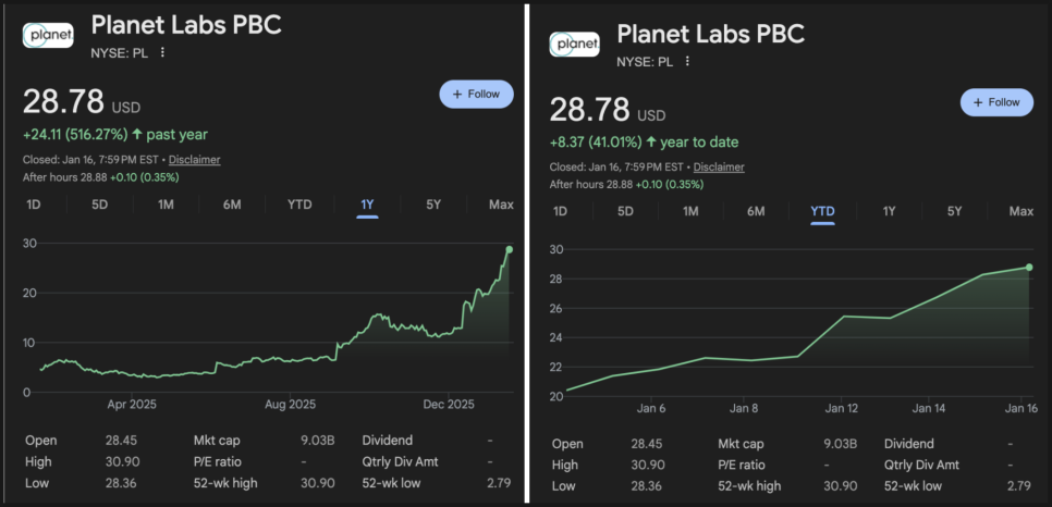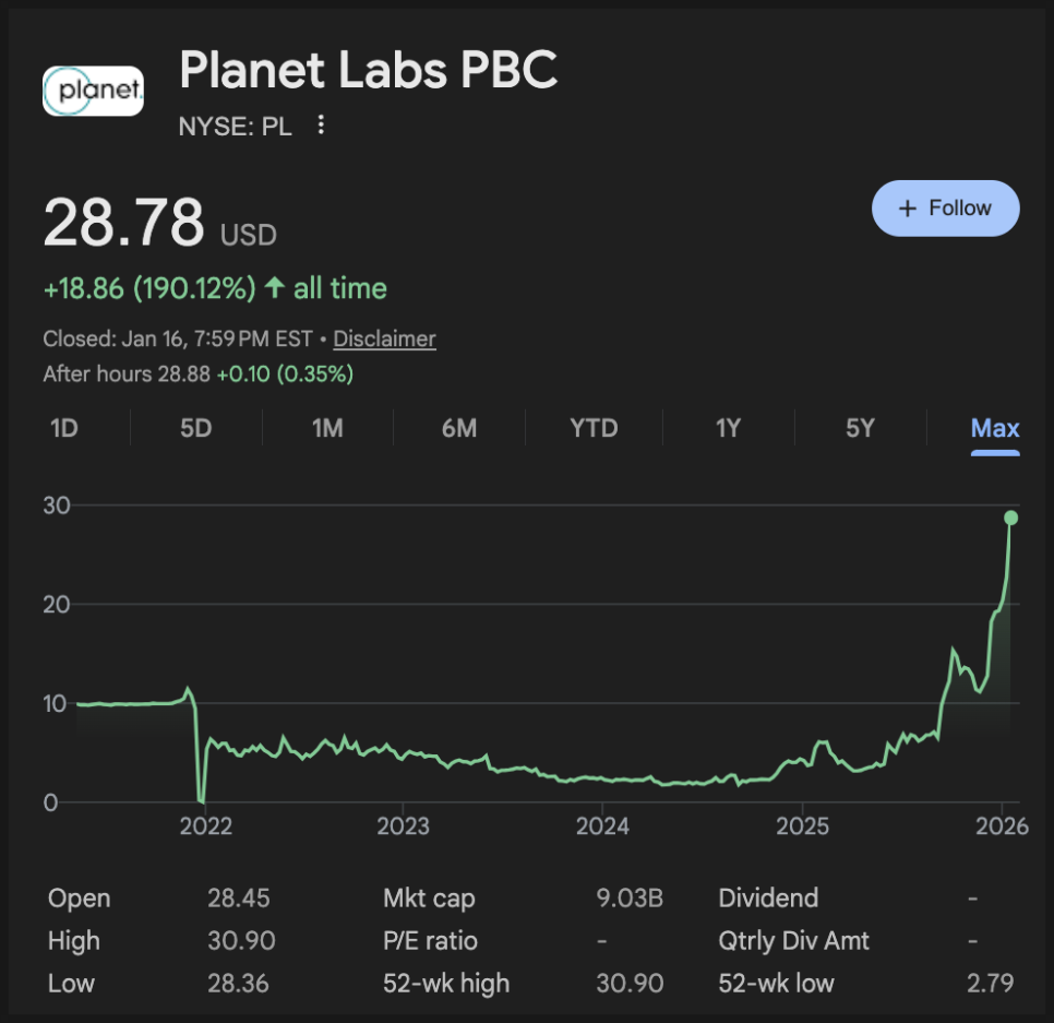 최근 플래닛 랩스 관련 업데이트를 보면, 대형 정부 계약을 추가로 확보했고, 실적과 가이던스 모두에서 의미 있는 개선을 보여줬으며, 이에 따라 애널리스트들의 시각도 조금씩 달라지고 있습니다. 주가가 크게 반응하면서 과거 상장 과정에서 약속됐던 조건부 주식 발행도 실제로 이뤄졌는데, 이 역시 최근 이슈 중 하나입니다.