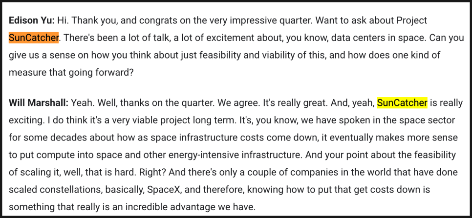 참고로 실적 발표 자리에서는 프로젝트 선캐처(Project SunCatcher)에 대한 질문이 나왔습니다. 핵심은 “우주에서 AI 연산을 하는 데이터센터가 현실적으로 가능한가”였는데요. 윌 마셜 CEO는 이 프로젝트가 아직은 연구개발 단계라는 점을 분명히 하면서도, 장기적으로는 매우 큰 시장이 될 수 있다고 설명했습니다. 위성 발사 비용과 인프라 비용이 충분히 낮아지면, 에너지와 냉각 측면에서 오히려 우주가 더 효율적인 연산 공간이 될 수 있다는 논리입니다. 이번 프로젝트는 대규모 상업화가 아니라, 구글(Google)의 TPU를 위성에 탑재해 열 방출과 군집 운용 같은 핵심 기술을 검증하는 것이 목적이라고 밝혔습니다. 다만 이 실험이 성공할 경우, 수천 기 규모로 확장될 가능성도 열려 있다는 점에서 ‘미래 옵션’의 성격이 강하다고 볼 수 있습니다.