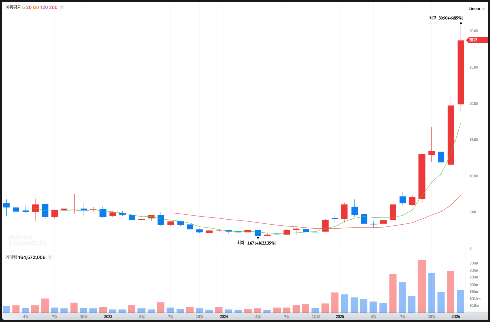 종합해서 정리하면, 월봉과 주봉 기준으로는 여전히 명확한 상승 추세 안에 있고, 구조적으로 추세가 꺾였다고 볼 만한 신호는 아직 보이지 않습니다. 반면 일봉에서는 단기 과열 신호가 강하게 나타나고 있어, 지금 가격대는 방향성보다 변동성에 더 주의해야 하는 구간이라고 볼 수 있습니다. 이 종목은 이제 바닥에서 막 출발하는 종목이 아니라, 이미 시장의 관심과 기대가 충분히 반영된 상태이기 때문에, 차트상에서는 타이밍 관리가 훨씬 중요해진 단계라고 정리할 수 있겠습니다.