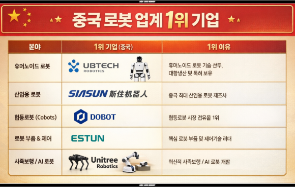 중국은 분야별로 각각 전문으로 하는 로봇기술이 회사마다 다르다. UBTECH ROBOTICS는 대표적인 휴머노이드 로봇 생산 회사로 WALKER 시리즈 같은 인간형 로봇 기술에서 중국 내 최고 수준이라 세계 최고급이다. SIASUN ROBOT & AUTOMATION은 산업용 로봇 분야 최고봉으로 중국과학원 산하로 2000년대부터 정부 지원하에 산업용 로봇을 생산하고 있다. ESTUN AUTOMATION은 중국 로봇산업 중 가장 오래된 기업으로 산업용 로봇 및 핵심부품 기술에 선두주자이다.