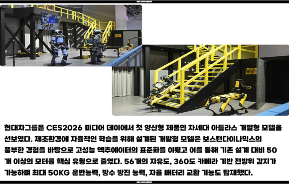 CES2026에서 현대차 미디어 데이에서 현대차는 스마트폰에 버금갈 만한 큰 변화의 전환점에 서있다고 발표했다. 이제 새로운 비전은 "범용 휴머노이드"로 이를 산업현장에 적용하고 더이상 연구실에 보관하지 않는다고 언급했다. 그리고 현대차의 휴머노이드 아틀라스가 "베스트 로봇상"에 수상할 정도로 고평가를 받았다. 대다수 관절을 360도 회전할 수 있는 56자유도를 가지며 촉각센서를 갖추고 있어 물체를 파손없이 들고나가며 이족보행도 가능하다.