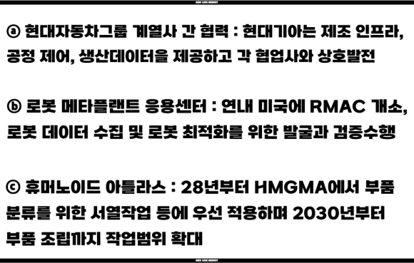 현대차에서 사람처럼 걷는 로봇인 "아틀라스"를 최근 CES에서 선보였다. 이 로봇은 사람처럼 관절이 달려있어 사람처럼 12개의 움직임을 보여준다. 아틀라스는 현대차 그룹이 인수한 미국의 보스턴다이나믹스에서 개발하였다. 단순히 사람을 닮은 로봇이 아니라 피지컬 AI가 알아서 행동할 수 있도록 지능까지 탑재하는 것이다. 이를 통해 매우 위험하고 지루한 반복 작업은 로봇이 하며 사람은 지식집약적, 고부가가치 업무에 집중할 수 있게 한다. 그렇게 된다면 현대차가 원한 강성노조가 없는 사업장을 만들 수 있을 지도 모르겠다.