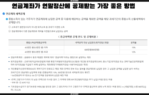 연말정산에서 환급받을 확률을 키우는 방법은 "연금계좌"이다. 연금저축 + IRP는 합산으로 최대 900만원까지 세액공제가 가능하다. 연봉이 5,500만원 이하면 최대 900만원 공제에 세액공제율이 15%이므로 135만원이 공제되고 연봉이 5,500만원 초과면 12% 공제되어 108만원이 공제된다.