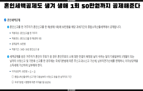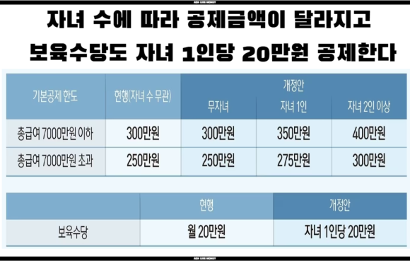 결혼율도 감소하는 사회라 혼인세액공제도 생겨 생애 1번 50만원 공제해준다. 저출산이 심해지는 사회이기에 자녀 부양수에 따라 세액공제가 확대되었다. 자녀 1명은 25만원, 자녀 2명은 55만원, 자녀 3명 이상은 55만원 + 1명당 40만원의 공제가 가능해진다. 그리고 회사에서 출산축하금에 대해서도 모두 비과세가 적용된다. 우리나라에서 자녀축하금으로 가장 많이 주던 회사는 부영인데, 부영은 1억이나 지원해준다. 자녀를 낳아 받는 축하금 1억은 비과세가 되고 한도까지 정해져있지 않다.