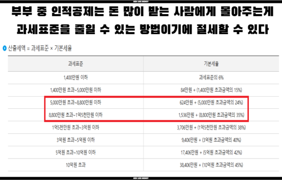 맞벌이 부부의 경우 소득이 높은 사람에게 인적공제를 몰아주는 것이 더욱 세금을 아낄 수 있는 방법이다. 왜냐하면, 인적공제는 과세표준을 줄이기에 세율이 높은 사람일수록 같은 공제금액으로 절세효과가 크기 때문이다.