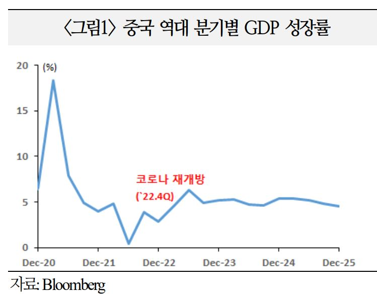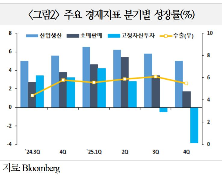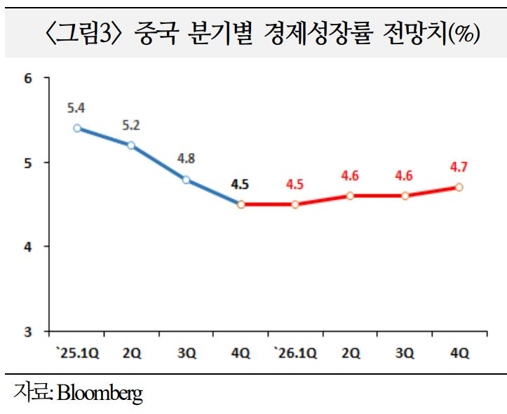 생산과 수출이 다소 완만해지나, 첨단투자 및 소비를 중심으로 한 정부 부양조치가 성장률을 견인할 소지(`25년 5.0%→`26년 4.5%)