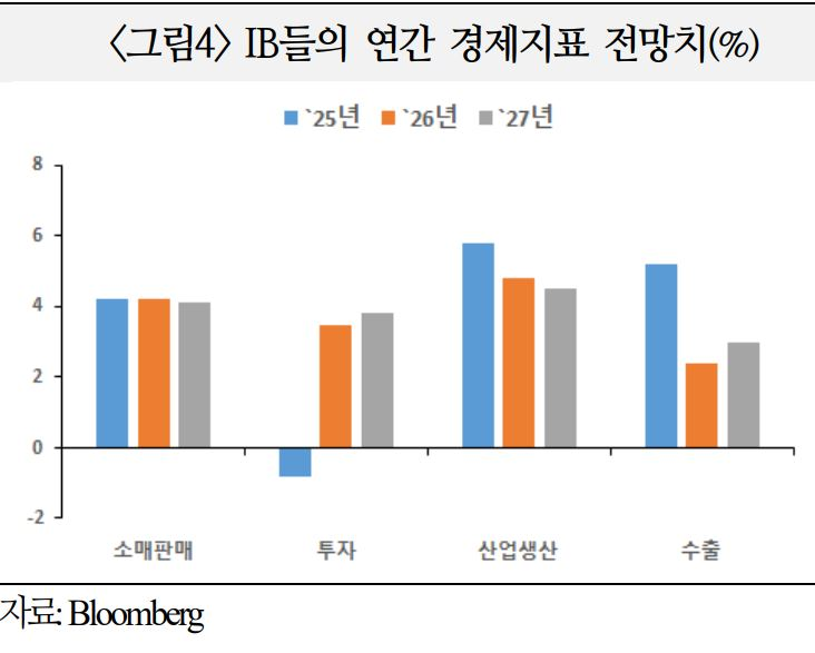 상고하저였던 작년과 달리 금년에는 전반적으로 4%대 중반대의 고른 성장이 예상(`26년전망치4.5%, Bloomberg). 부문별로는 수출 둔화에도 불구하고 내수가 개선될 전망