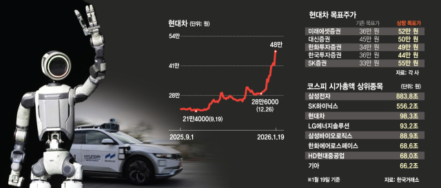 로봇 기업으로 재평가를 받고 있는 현대자동차는 주가가 이날 16% 넘게 오르며 한국 증시의 ‘4강 구도’를 깨고 시가총액 3위에 올라섰음