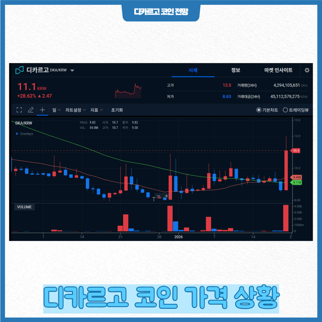 2025년 초 기준 디카르고는 알트코인 순환매 장세와 특정 호재 영향으로 단기간 상승세를 기록한 바 있습니다. 예를 들어 카카오페이 관련 이력이 부각되면서 30원대 후반에서 40원 이상까지 급등한 사례도 확인됐습니다.