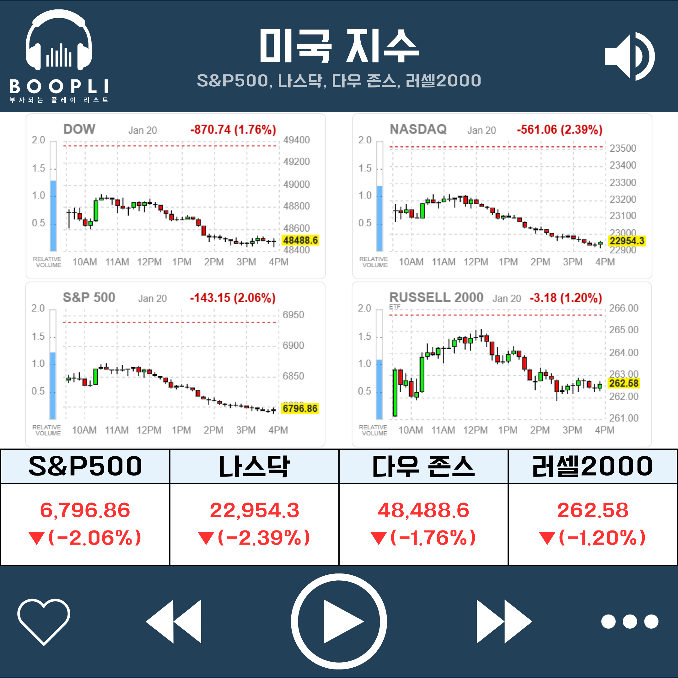 전일 미국 증시는 트럼프 대통령의 그린란드 관세 위협에 따른 미·유럽 갈등과 일본발 장기금리 급등이라는 복합 악재 속에서 다우(-1.76%), S&P500(-2.06%), 나스닥(-2.39%), 러셀2000(-1.20%) 등 4대 지수 모두 하락 마감