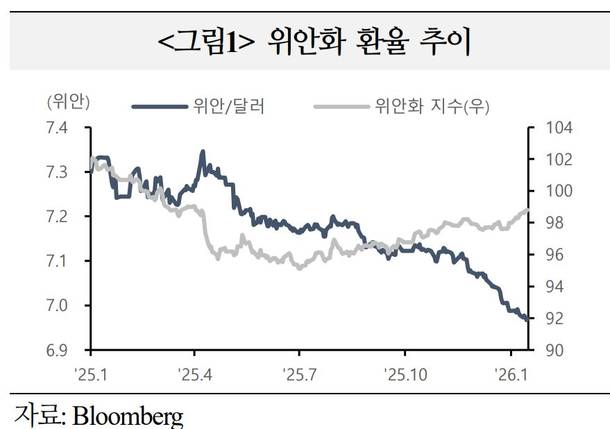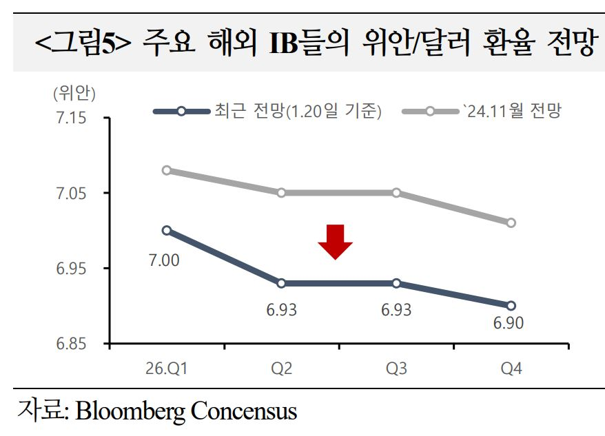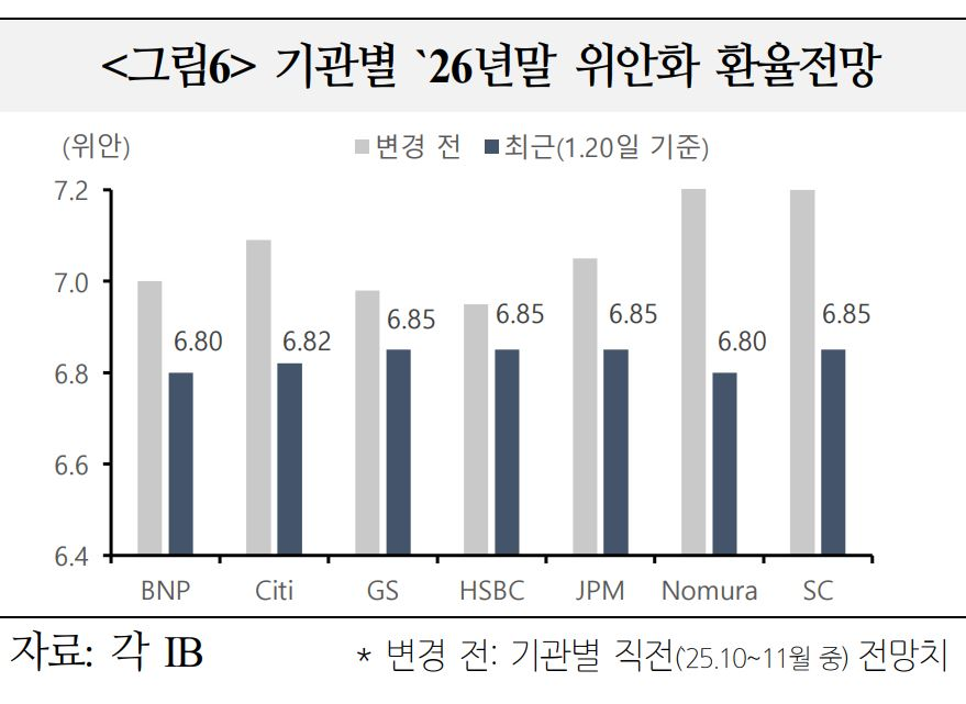 * 위안/달러 예상 경로: `26년 3월말 7.00위안 → 6월말 6.93위안 → 9월말 6.93위안 → 12월 6.90위안(1.20일 기준)
