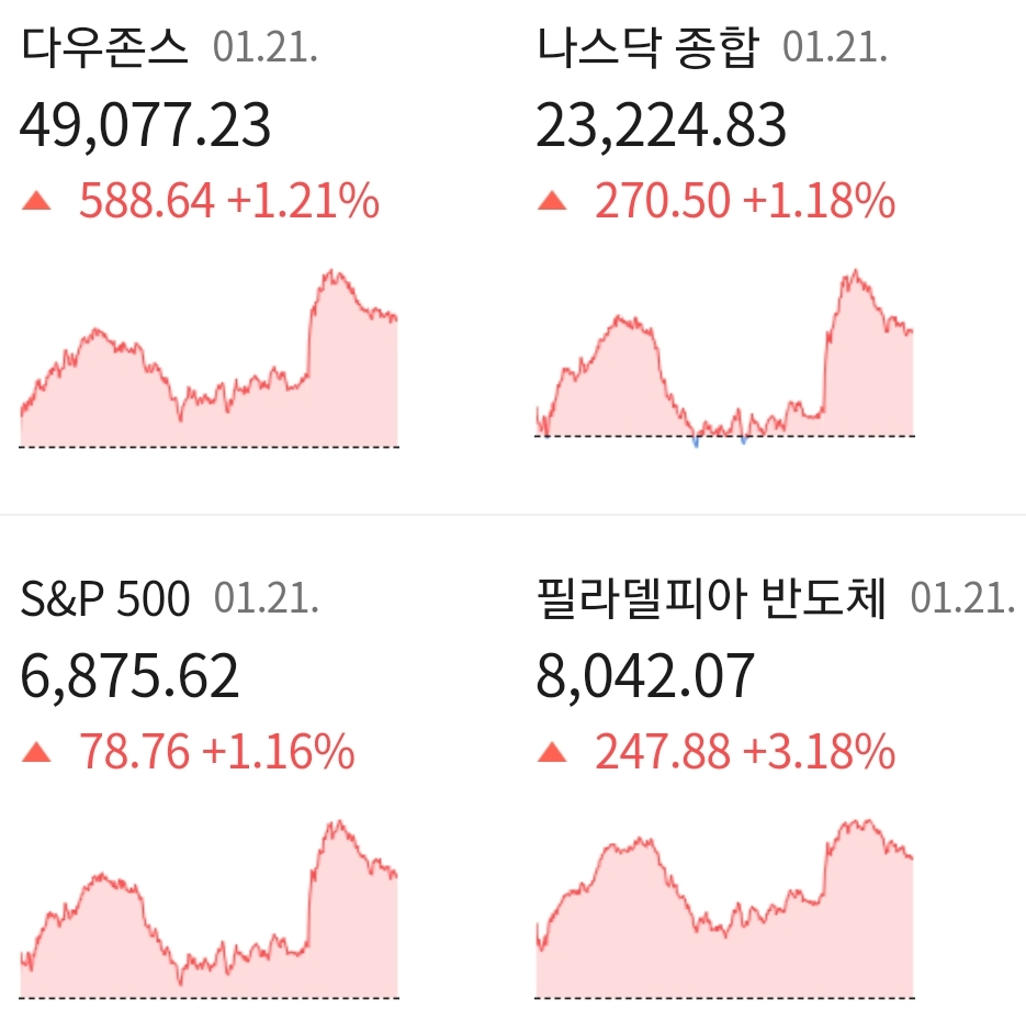 현지 시간 21일 미국 뉴욕 증시는 3대 지수 모두 상승 마감하였습니다. 트럼프 대통령의 그린란드 통치 관련하여 EU 국가들의 충돌로 미국 증시가 타격을 받자, 그린란드 관련 국가 관세 철회, 무력 사용 배제를 밝히면서 일단은 믹구 주시시장은 안정 찾았는데요.