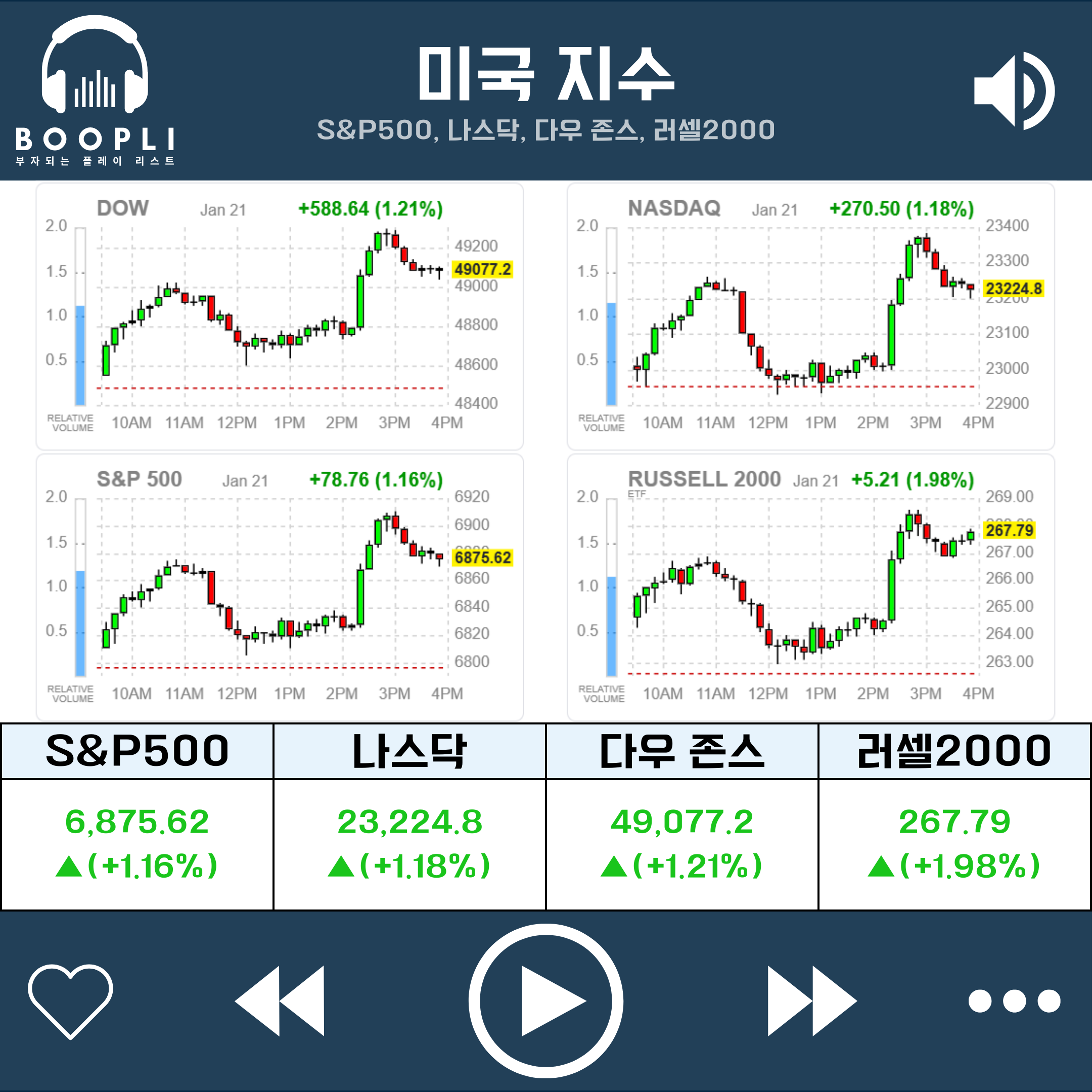 전일 뉴욕 증시는 트럼프 대통령이 그린란드 병합 문제와 관련해 무력 사용 가능성을 공식적으로 일축하고, 유럽 8개국에 대한 관세 부과 계획을 전격 철회하면서 지정학적·통상 리스크가 크게 완화됨에 따라 다우(+1.21%), S&P500(+1.16%), 나스닥(+1.18%), 러셀2000(+1.98%) 등 주요 지수가 일제히 상승 마감