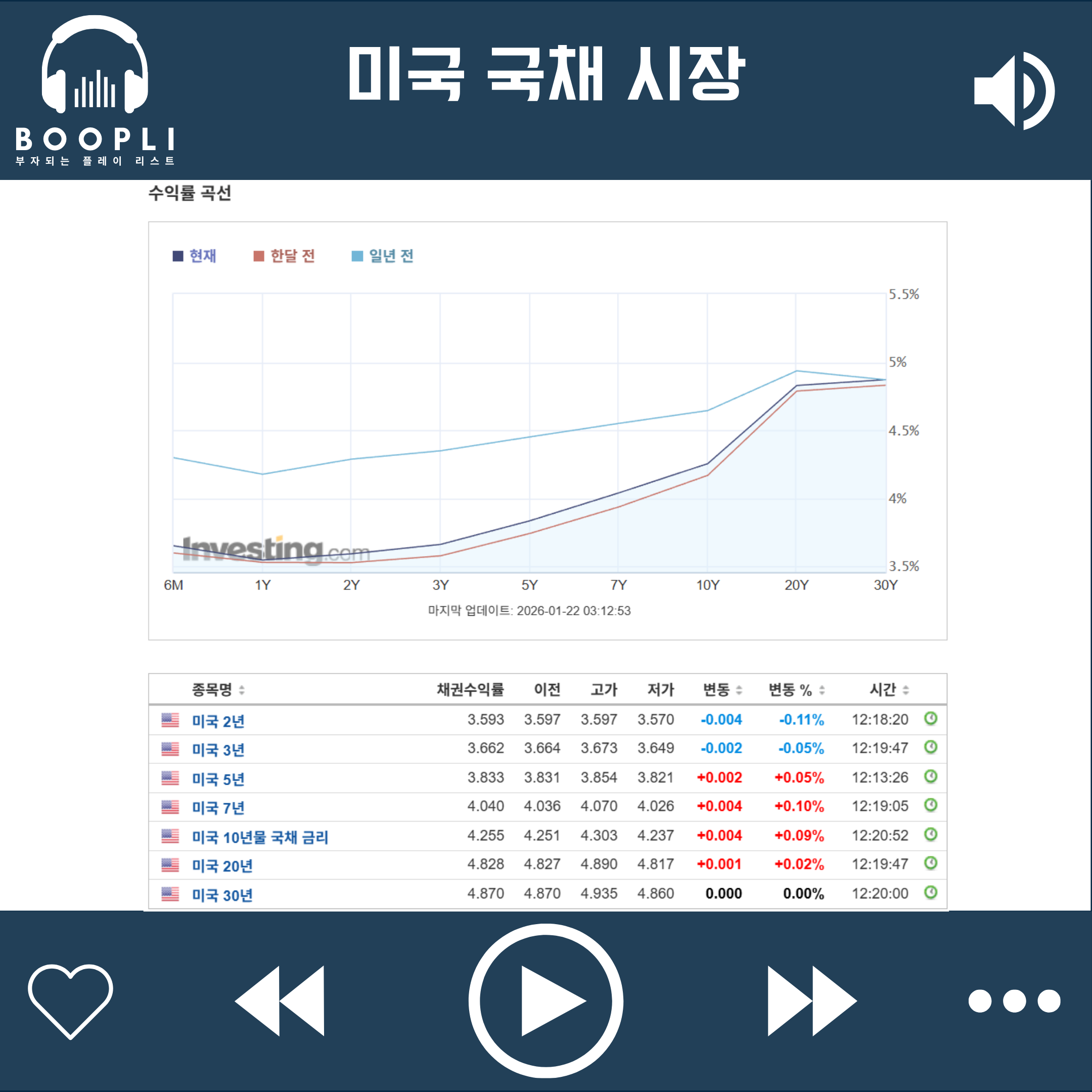 미국 국채는 트럼프 대통령의 그린란드 관련 관세 위협 철회와 20년물 국채 입찰 호조 속에 장기 금리는 하락, 단기 금리는 보합권