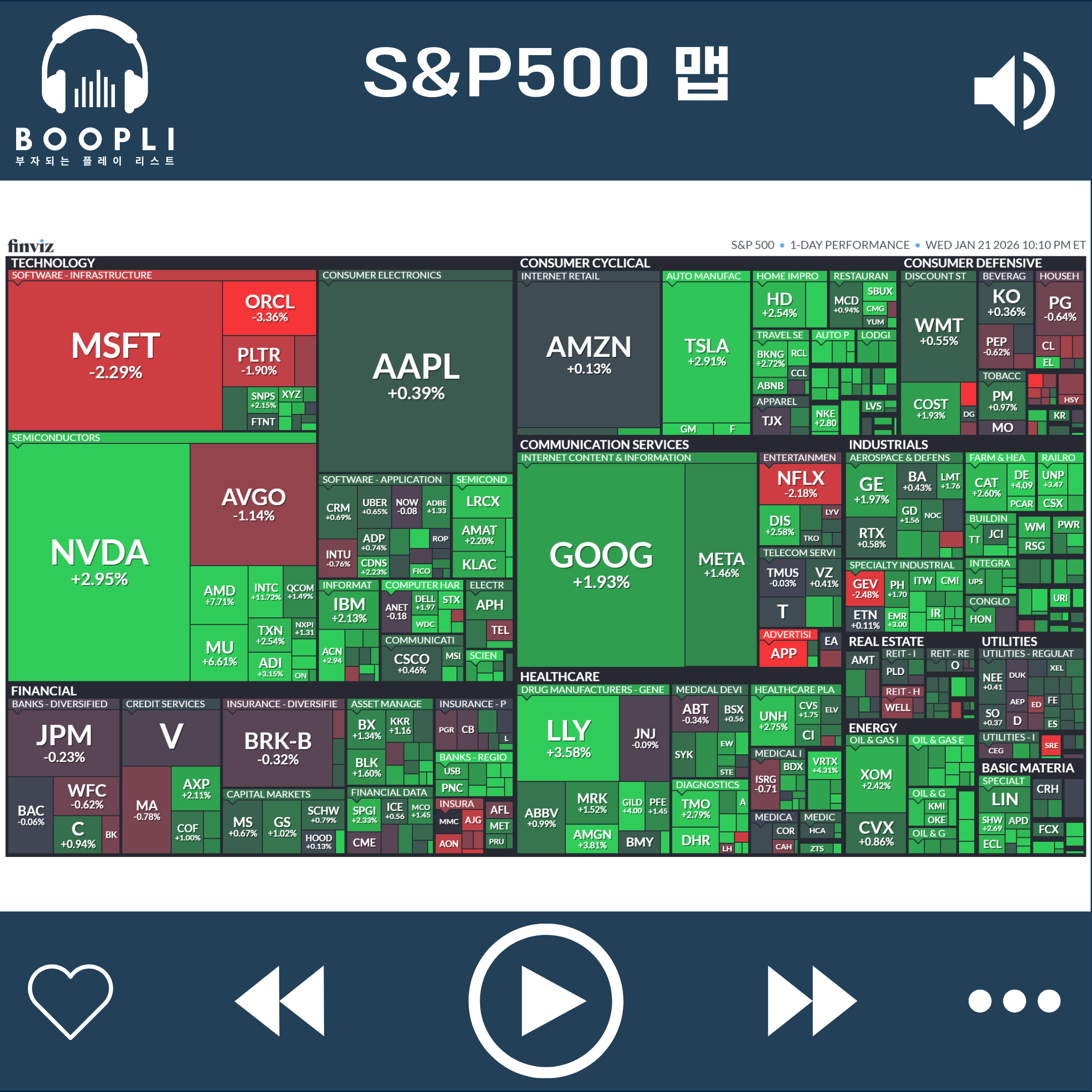 장 후반에는 트럼프 대통령이 2/1부터 시행 예정이던 유럽 8개국 대상 관세를 전격 철회한다는 소식이 전해지며 위험자산 선호가 급격히 회복됐고, 주요 지수는 일제히 강한 반등세로 전환