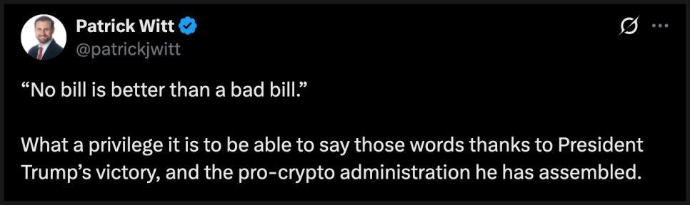 브라이언 암스트롱 코인베이스 CEO는 “나쁜 법안이라면 없는 게 낫다”고 공개적으로 말하며 지지 철회를 선언했습니다. 이에 대해 백악관 내부 반응은 상당히 날카로웠습니다. 트럼프 행정부의 디지털 자산 정책을 총괄하는 패트릭 위트는, 이 발언을 직접 인용하며 사실상 코인베이스를 공개 비판했습니다. 지금처럼 친(親)크립토적인 행정부 환경에서 법안 통과를 막는 건 업계 전체에 재앙이 될 수 있다는 경고였죠.