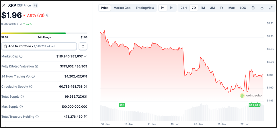 XRP는 하루에 3% 넘게 오르며 1.96달러 선까지 회복했습니다. 우선 현재로서 중요한 건 비트코인이 9만 달러 위를 지켜낼 수 있을지, 아니면 다보스발 안도감이 사라지면서 변동성이 다시 커질지가 되겠습니다.