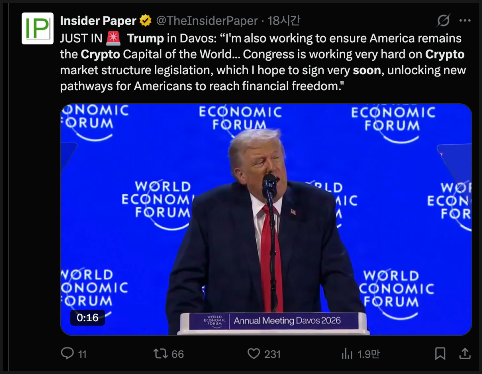 한편 도널드 트럼프 대통령이 크립토 시장 구조 법안을 빨리 서명하고 싶다고 다보스 세계경제포럼에서 공개적으로 밝혔습니다. 준비된 연설문을 읽던 도중 “비트코인, 전부 다”라는 표현을 덧붙이며, 이 법안이 미국을 크립토의 중심지로 만드는 데 중요한 역할을 할 것이라고 강조했습니다. 정치적 메시지로 보면 상당히 직설적인 지지 선언입니다.