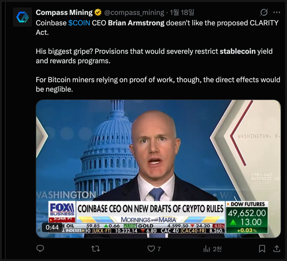 아시다시피 해당 법안은 얼마전 상원 은행위원회 표결을 앞두고, 미국 최대 크립토 거래소인 코인베이스가 돌연 법안 지지를 철회하면서 표결 자체가 연기됐습니다. 이 결정으로 의회 내부와 업계 모두가 크게 흔들렸고, 주요 의원들과 다른 크립토 업계 인사들 사이에서도 불만이 터져 나왔죠.