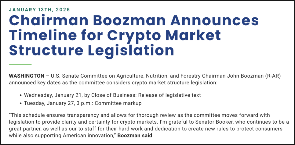 농업위원회 위원장인 존 부즈먼 의원도 “합의에 이르지 못한 건 아쉽지만, 여기까지의 협업 덕분에 법안이 더 나아졌다”고 말하면서도, 여전히 근본적인 정책 차이가 남아 있다고 인정했습니다. 이 법안은 디지털 자산을 상품으로 분류하고, 감독 권한을 상품선물거래위원회 쪽에 더 명확히 두는 내용을 담고 있습니다. 다만 민주당 지지가 없는 상태에서는, 상원을 통과하더라도 다음 단계로 넘어가기 쉽지 않습니다.