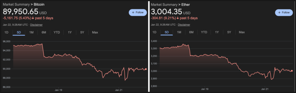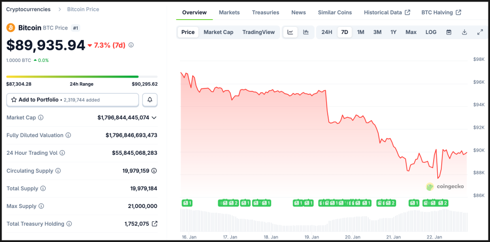트럼프 대통령은 수요일 다보스에서 그린란드와 관련한 관세를 더 이상 부과하지 않겠다고 밝혔습니다. 사실 이번 주 초반부터 트럼프 대통령이 유럽을 향해 강경한 무역 발언을 내놓으면서 글로벌 시장 전체가 위험 회피 모드로 들어갔고, 여기에 국채 금리 급등까지 겹쳤습니다. 주식 시장이 흔들리자 크립토도 같이 압박을 받았고, 비트코인이 8만7천 달러대까지 내려가기도 했습니다. 그러나 트럼프의 새 발언이 나온 뒤 빠르게 반등해 다시 9만 달러 위로 올라섰습니다. 현재는 8만9천 달러 중반대에서 가격이 형성돼 있습니다.