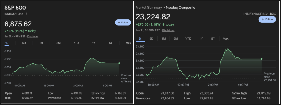 트럼프 대통령은 자신의 SNS를 통해, 북대서양조약기구 사무총장인 마르크 뤼터와의 회담을 언급하며, 그린란드와 북극 지역 전반에 대해 “미래 협상의 틀”을 마련했다고 설명했습니다. 그리고 이 이해를 바탕으로 2월 1일부터 예정돼 있던 관세를 부과하지 않겠다고 못 박았죠. 미국의 통제에 반대하는 유럽 국가들에 당장 관세를 부과하지는 않겠다고 말하자 시장이 안도한 겁니다.