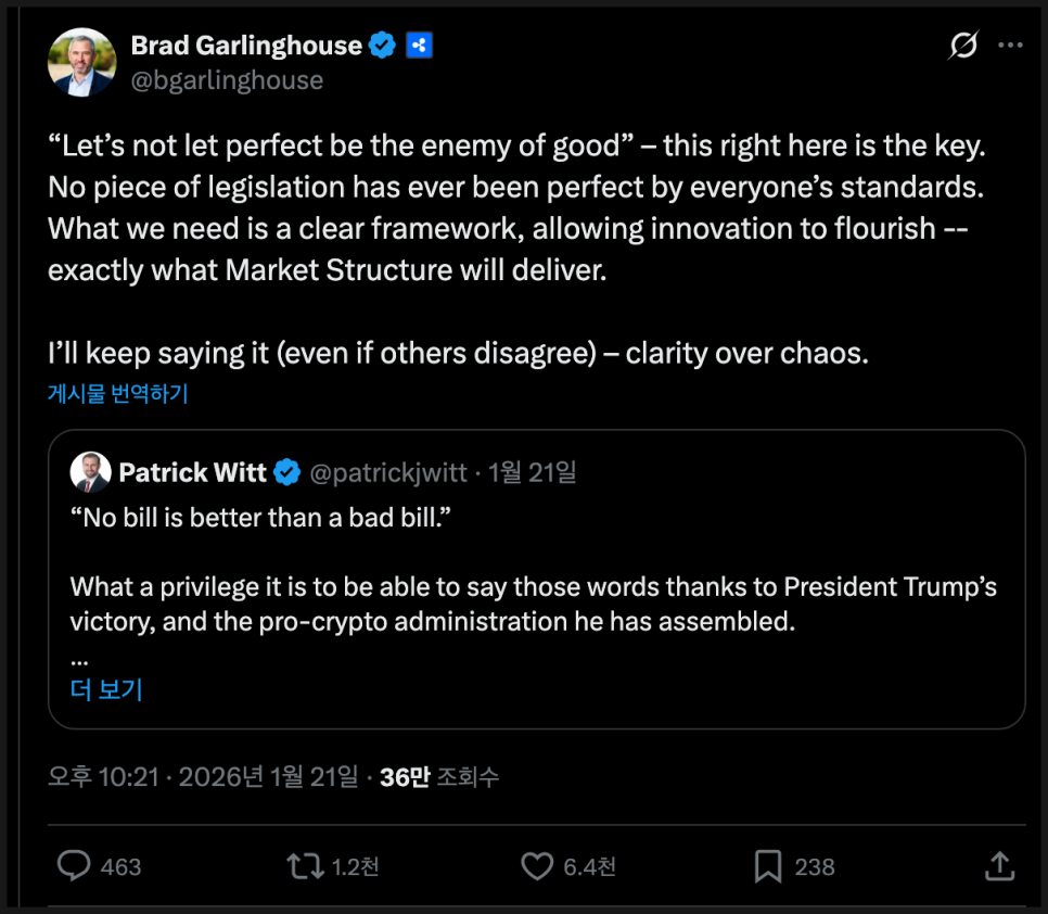 이 와중에 업계 내부에서도 의견은 갈립니다. 리플 CEO 브래드 갈링하우스는 완벽한 법안은 존재하지 않는다며, 지금은 명확한 규제 틀이 더 중요하다고 강조했습니다.