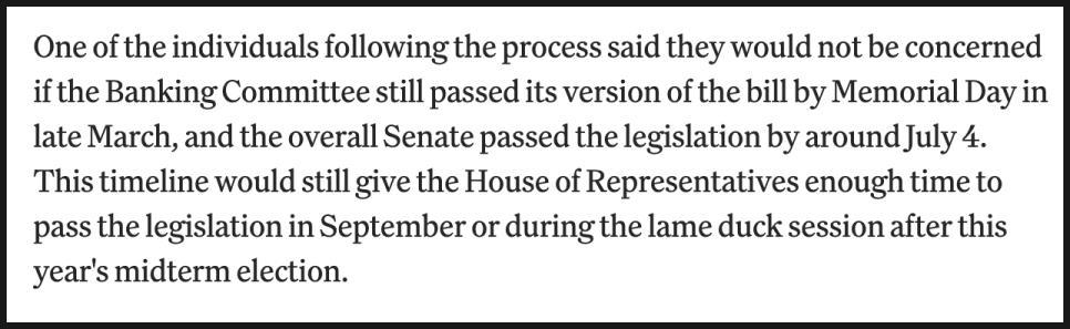 그럼에도 완전히 비관할 단계는 아니라는 시각도 있습니다. 법안 진행 상황을 지켜보는 관계자들 중 일부는, 은행위원회가 3월 말 메모리얼 데이 전후로 자체 법안을 통과시키고, 7월 초까지 상원 전체 표결이 이뤄진다면 일정상 큰 문제는 없다고 보고 있습니다. 그렇게 되면 하원은 9월이나 중간선거 이후 회기에서 법안을 처리할 수 있다는 계산입니다.