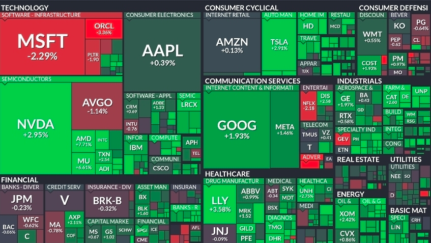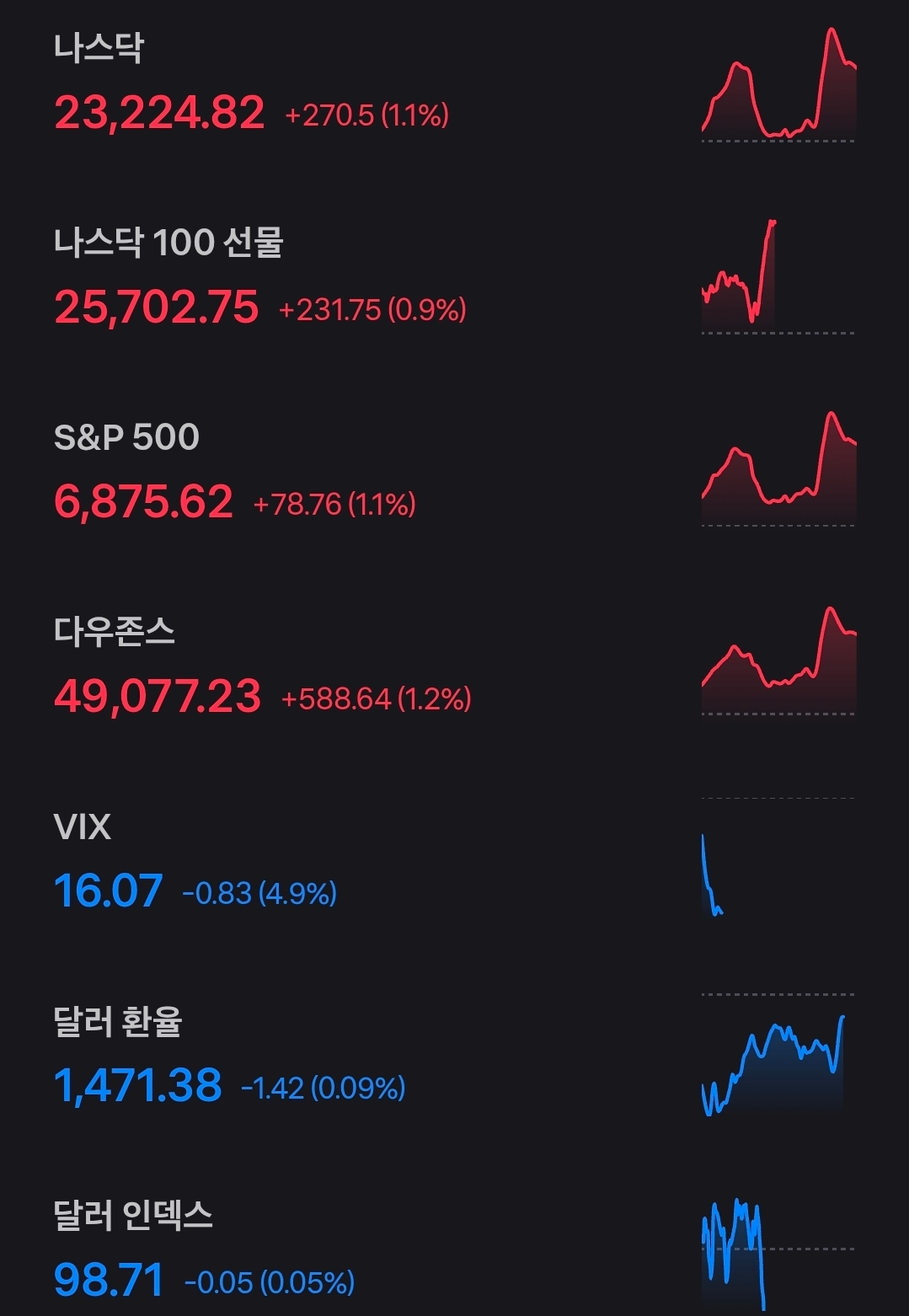 증시 맵을 살펴보면 반도체와 대형 기술주들이 초록빛으로 물들며 시장의 반등을 주도했습니다. 엔비디아와 AMD 그리고 마이크론 등 주요 반도체 기업들이 강력한 상승세를 보였고 이는 인공지능 산업에 대한 자금 유입이 실질적인 기업 가치 상승으로 이어지고 있다는 믿음을 보여줍니다. 반면 일부 소프트웨어와 금융 섹터에서는 약세가 관찰되며 업종별 차별화가 진행되는 양상입니다. 특히 나스닥 지수가 1% 이상 상승하며 전날의 하락분을 상당 부분 회복한 것은 기술적 반등 이상의 의미를 지니며 주력 산업의 펀더멘털이 여전히 견고함을 입증했습니다.