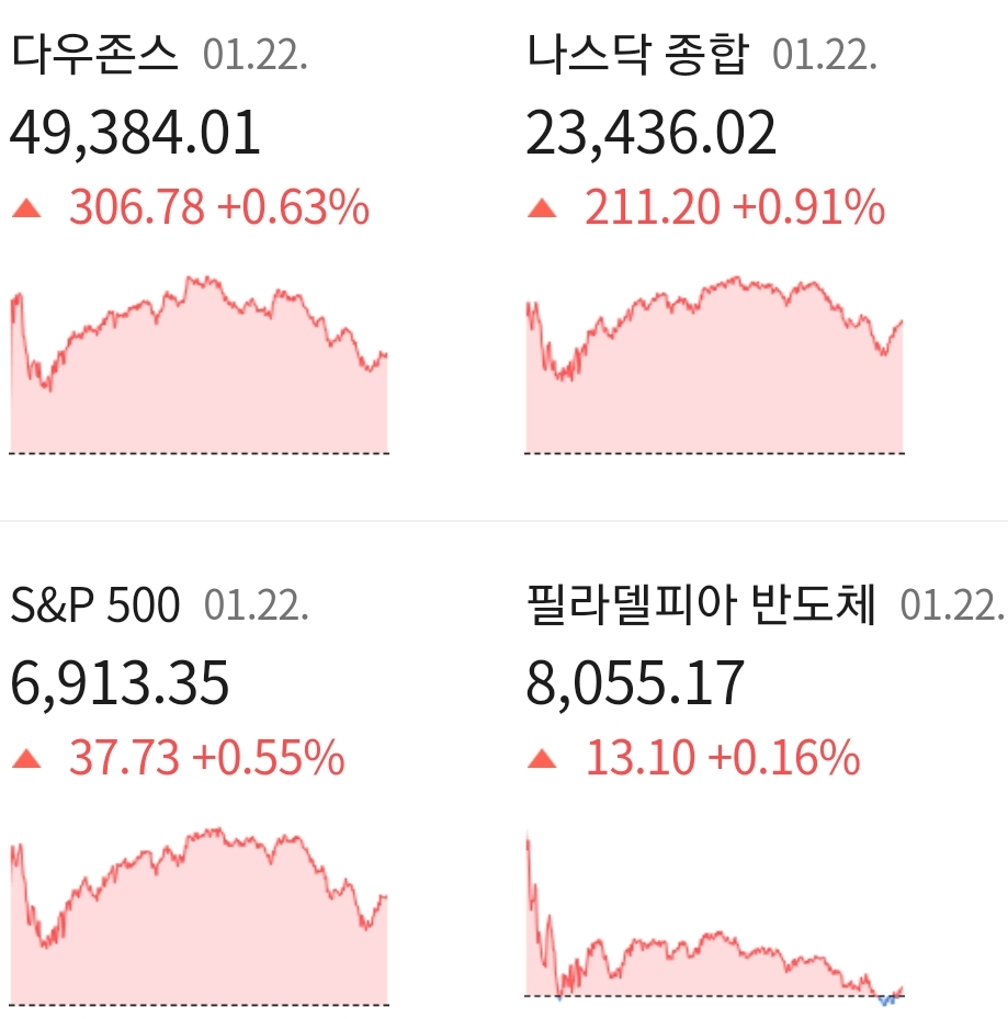 현지 시간 22일 미국 뉴욕 증시는 3대 지수 모두 상승 마감하였습니다. 미국과 EU 간 그린란드를 둘러싼 분쟁이 완화되었고, 미국 11월 CPI 물가 또한 시장 예상치를 부합하면서 투자 심리가 긍정적으로 반응한 결과로 분석되고 있습니다.