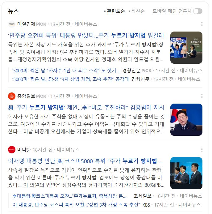ㅇ 23일 이소영 더불어민주당 의원실에 따르면 이 대통령은 전날 민주당 코스피5000특별위원회 소속 의원들과의 청와대 오찬 자리에서 자본시장 활성화 방안을 논의하며 이른바 '주가누르기 방지법' 추진에 공감을 표했다. 이 의원은 오찬 직후 자신의 사회관계망서비스(SNS)를 통해 "(대통령이) 주가누르기 방지법에 공감을 표하며 빠르게 추진하자는 말씀을 주셨다"며 "내가 대표 발의한 상속·증여세법을 부르는 이름"이라고 환영했다.