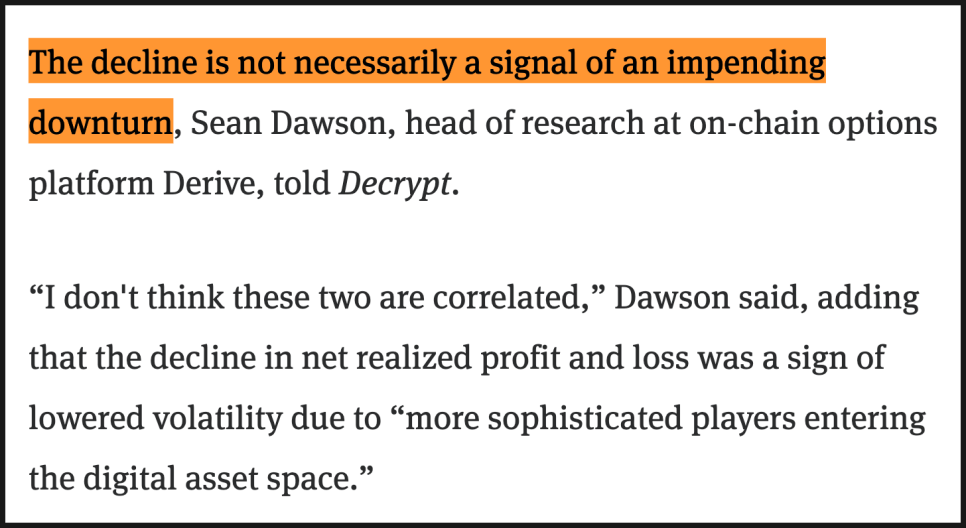 다만 모든 전문가가 이를 곧바로 하락 신호로 해석하는 것은 아닙니다. 온체인 옵션 플랫폼 Derive의 리서치 책임자인 션 도슨은, 실현손익 감소가 반드시 가격 하락을 의미하지는 않는다고 선을 그었습니다. 오히려 기관과 전문 투자자들이 늘어나면서 시장 구조가 더 성숙해지고, 변동성이 낮아진 결과일 수 있다고 설명합니다.