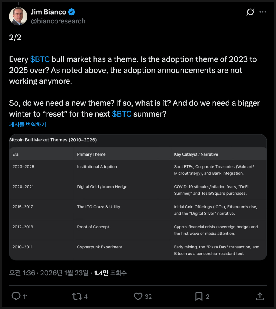 이 문제를 먼저 제기한 인물은 비앙코 리서치 대표인 짐 비앙코입니다. 그는 X에 올린 글에서 “비트코인 채택 관련 발표들이 더 이상 시장을 움직이지 못하고 있다”고 말하며, 새로운 내러티브가 필요한데 아직 그게 보이지 않는다고 지적했습니다.