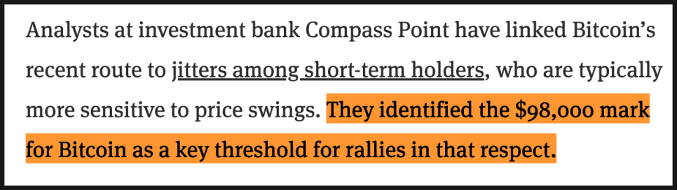 한편 투자은행 컴퍼스포인트는 최근 하락의 배경으로 단기 보유자들의 불안을 꼽았습니다. 이들은 가격 변동에 특히 민감한데, 비트코인이 다시 강하게 반등하려면 9만 8천 달러 선을 회복해야 한다는 분석입니다.