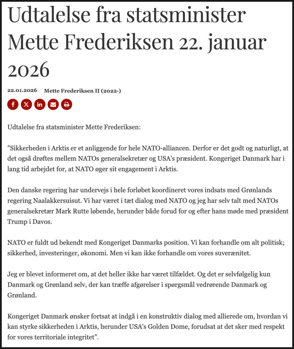 다음 날 덴마크 총리 메테 프레데릭센은 트럼프의 태도 변화 자체에는 열린 입장을 보였지만, 주권은 협상의 대상이 될 수 없다며 미국이 국가 안보를 이유로 그린란드를 소유해야 한다는 주장에는 분명하게 선을 그었습니다.