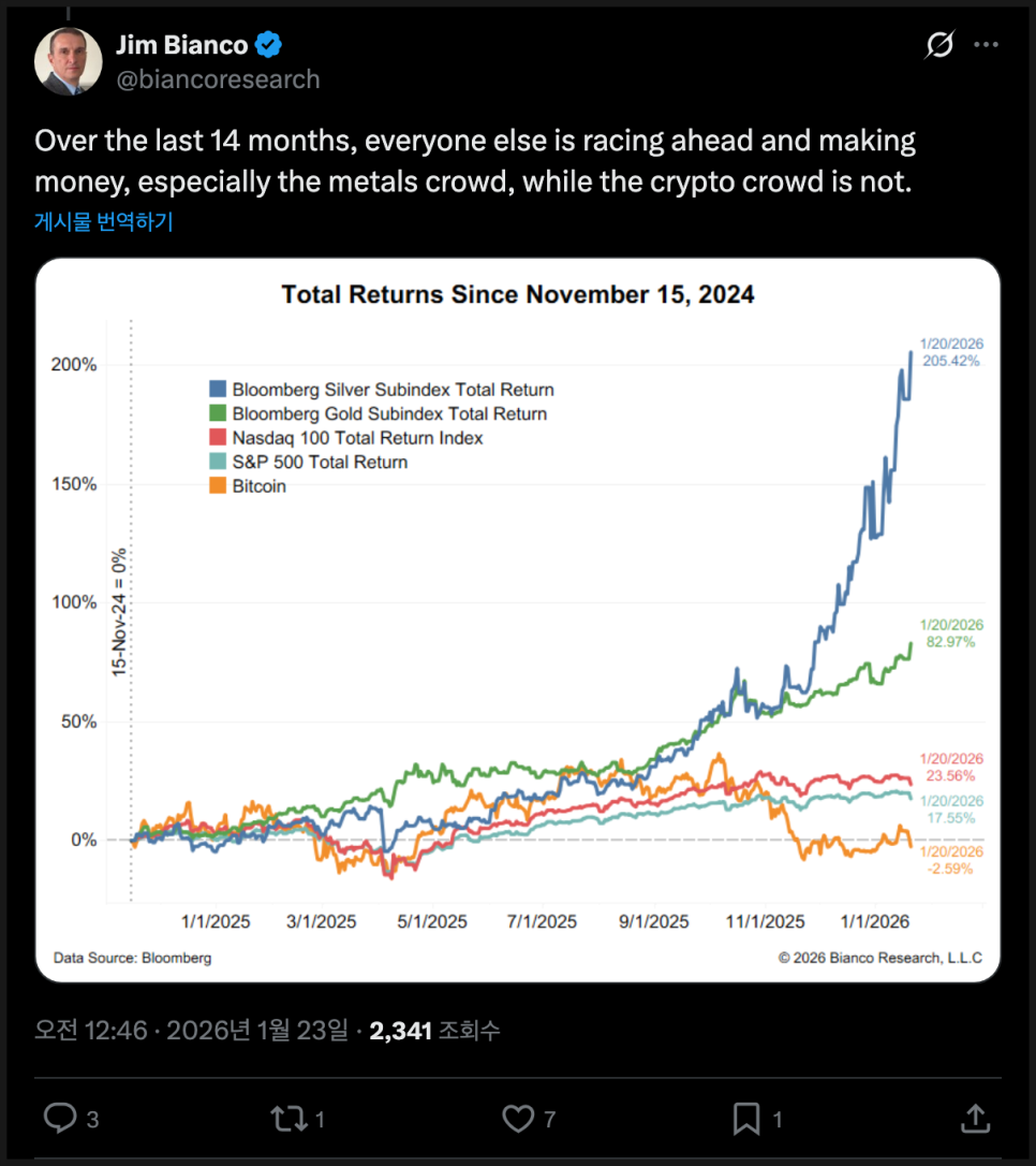 비앙코는 “새로운 테마를 기다리는 동안, 다른 자산들은 전부 앞으로 달려가는데 비트코인만 진흙탕에 갇혀 있는 모습”이라고 표현했습니다. 비트코인이 모든 자산 대비 확실한 우위를 보여주지 못하고 있다는 점을 강조한 셈입니다.
